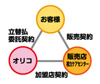 この仕組みは、お客さまと視力ケアセンター(株式会社地球人クラブ)の間の売買契約・役務提供契約の代金等の決済手段として、現金に代わってクレジット制度を利用する場合のものです。 お客さまがこの仕組みを利用してお買物等をされるときは、まず、お客さまからのお申込みを受けた販売店がオリエントコーポレーションに連絡をとり、オリエントコーポレーションはお客さまの審査をさせていただきます。オリエントコーポレーションがお客さまのお申込みを承諾したときは、お客さまのお買上げの代金は、オリエントコーポレーションがお客さまの委託により販売店に立替払いいたします。お客さまは、お買上げ代金に手数料を加えた額を分割払いで、オリエントコーポレーションにお支払いいただくことになります。つまり、お客さまは販売店と商品等売買契約を結ぶだけでなく、オリエントコーポーレーションとの間に、立替払委託契約を結ぶことになります。