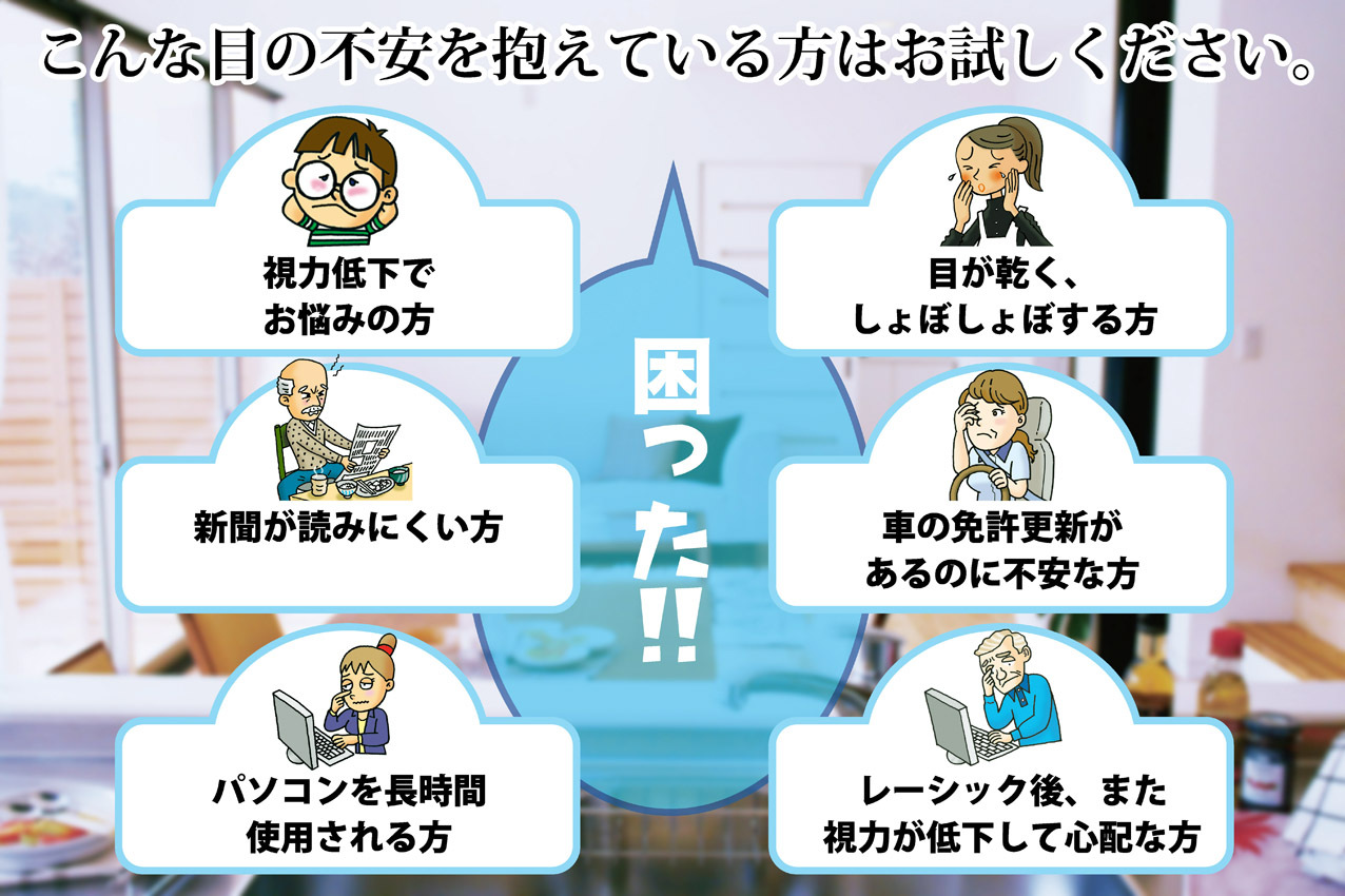 目の疲れがつらい方、視力低下でお悩みの方、メガネやコンタクトレンズが目に合わない方、ぼんやり見える方、パソコンを長時間使われる方、朝と夕方で見え方が違う方など、年齢には関係なくご使用いただけます。